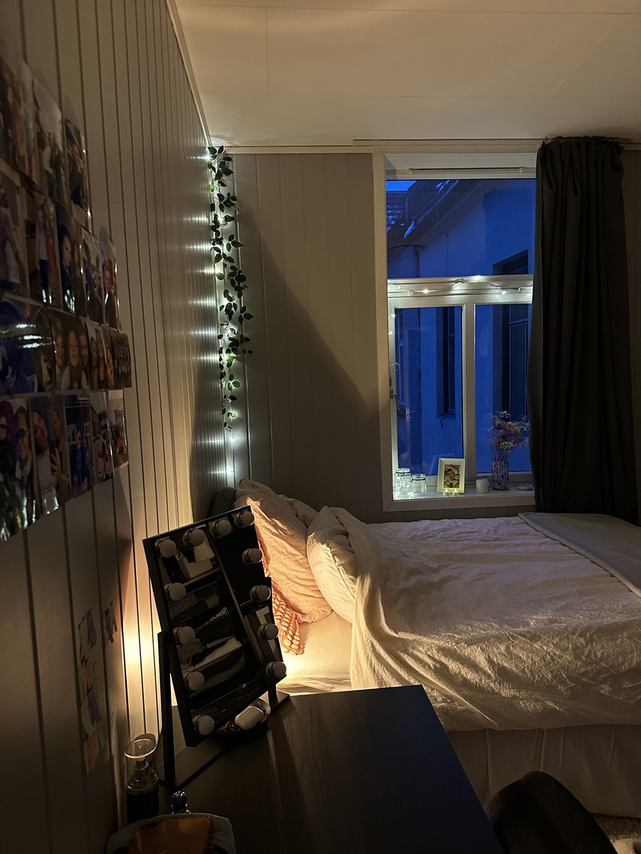 Jeg leier ut rom nr. 6, som er det største rommet på 12 kvm. Det vil være møblert med både seng, skap, pult, stol, tv, speil m.m. Du vil dele bad sammen med 2 andre.