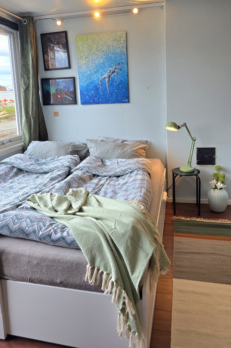 Ikke på bilder: sammenleggbart spisebord med stoler og TV (chromecast bare). Seng kan skyves sammen til enkeltseng og settes der sofa står slik at man får større stuedel og ha spisebord og stoler stående oppslått.