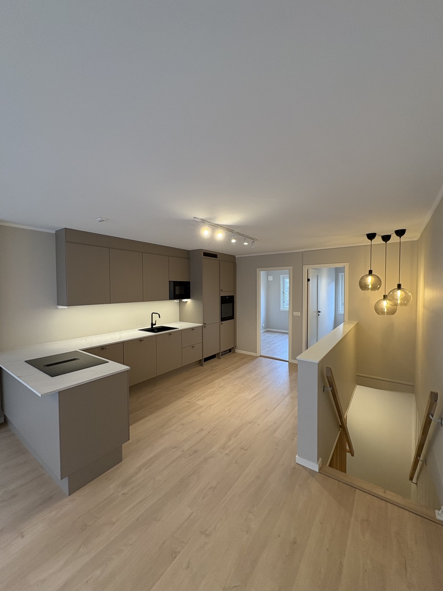 Stort, nytt HTH-kjøkken – Kjøkkenet er moderne og funksjonelt med smarte løsninger og rikelig med arbeidsflater. Hvitevarer inkludert: mikro, ovn, platetopp med innebygd ventilator, kjøleskap/fryser og oppvaskmaskin.