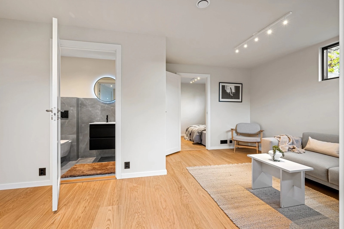 - Badet er flislagt med varmekabler hvor det følger med vaskemaskin.
