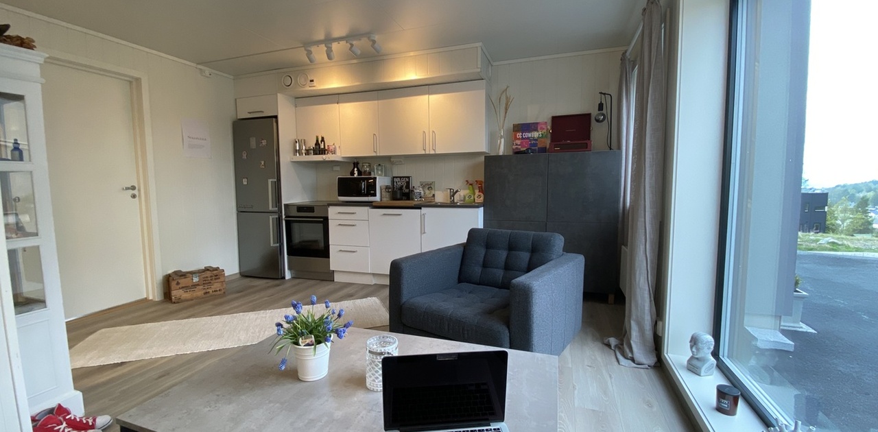 leiligheten har åpen kjøkken - stue løsning, med eget bad og soverom.