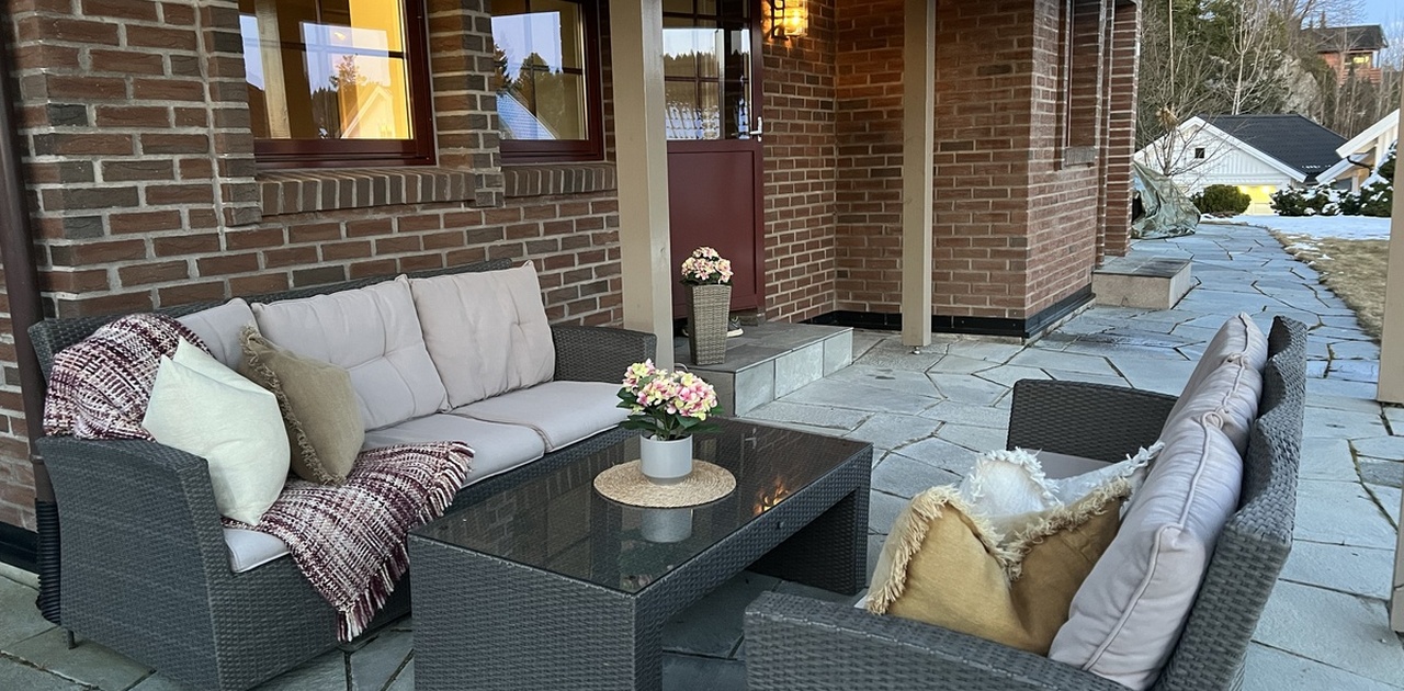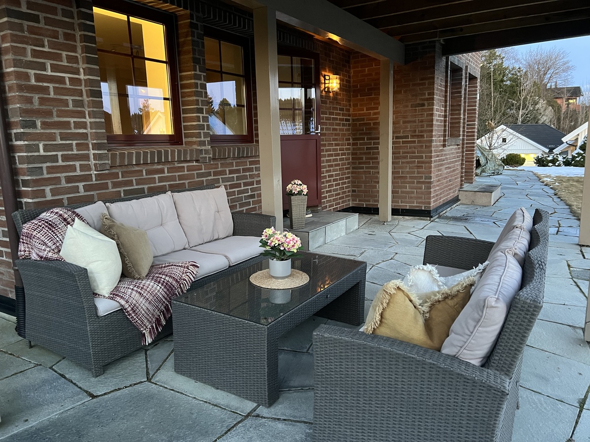 Stor solrik overbygd uteplass med utsikt til koselig grøntareal.