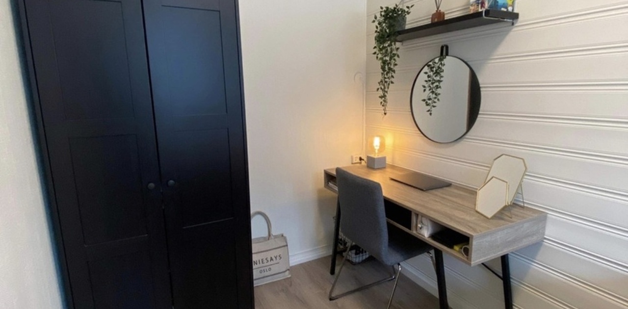 Rommet på bildet er 8 kvm og møblert med et klesskap. 120 seng kan følge med om ønskelig. Det er plass til 120-150cm seng på rommet. Et stort vindu gjør rommet lyst og luftig noe som er veldig trivelig! Både varmtvann og internett er inkludert i husleie. Strøm kommer utenom.