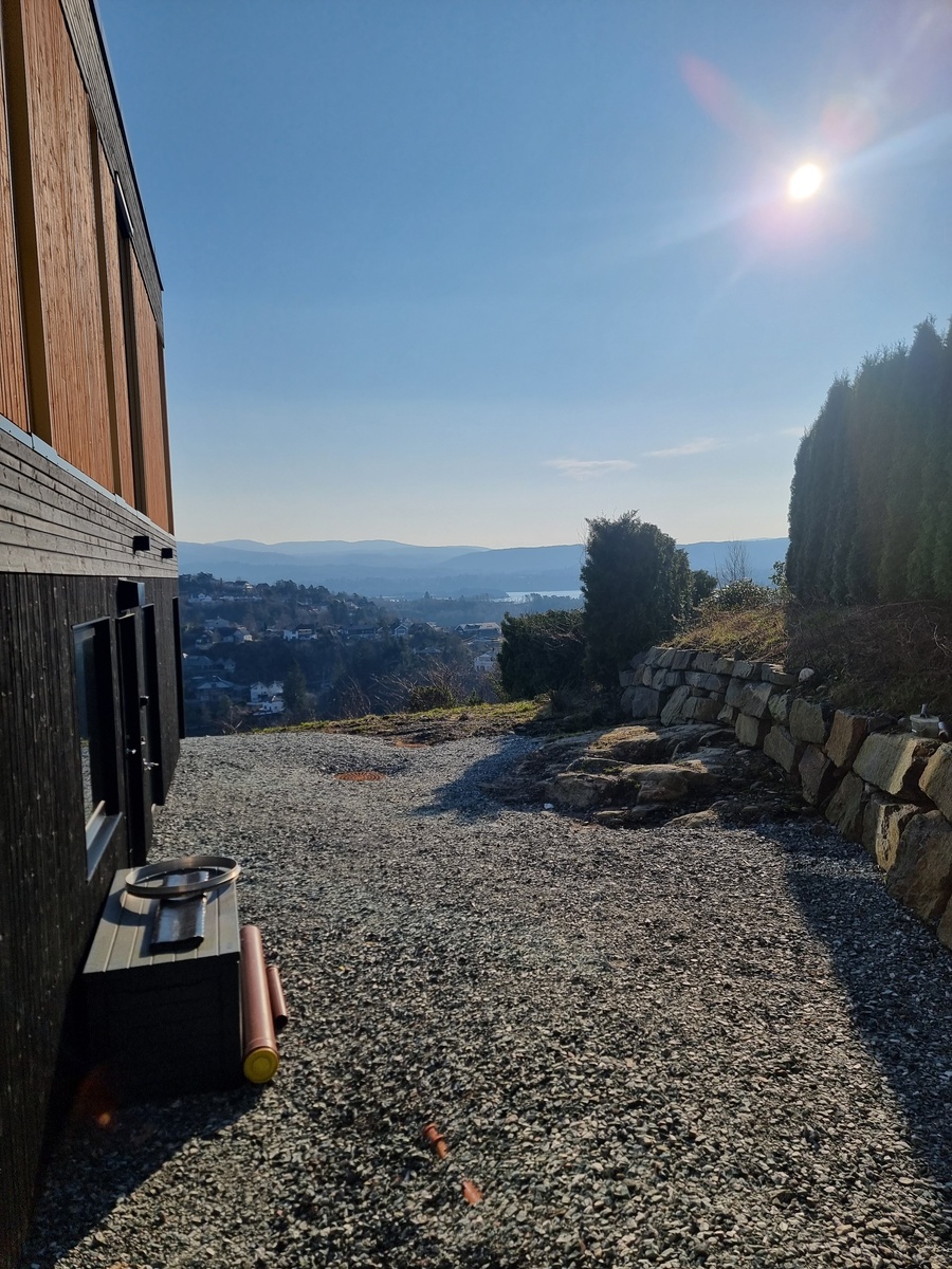 To soverom, åpen stue- og kjøkkenløsning, bad. Vannbåren varme i alle gulv inkl i husleie. Parkeringsplass til én bil med elbil-lader. Stor uteplass tilhørende utleiedel (bildene er tatt før platting hadde kommet).