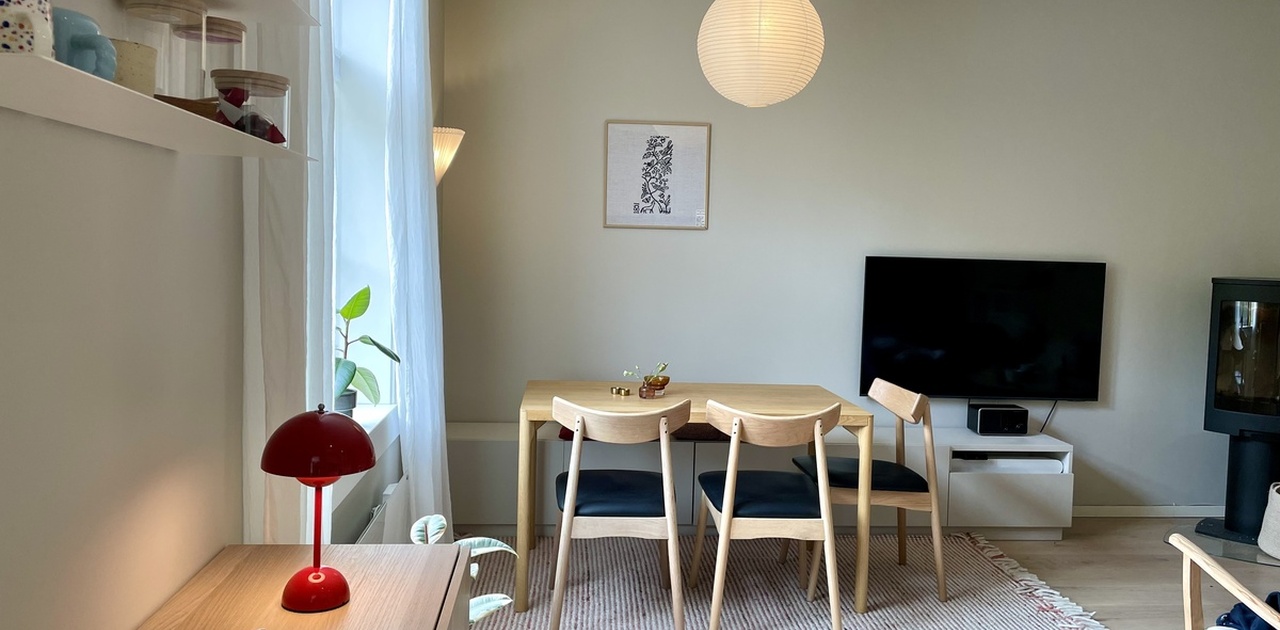 Om leiligheten: 42 kvm, nylig renovert. Leies ut møblert. Består av separat soverom med seng og garderobe, åpen kjøkken og stue (spisebord, sofa og tv), separat gang med kott til oppbevaring, bad fra 2018 med vaskemaskin. Ligger i en høy 1.etasje med store vinduer. Hyggelig borettslag med fint opparbeidet bakgård.