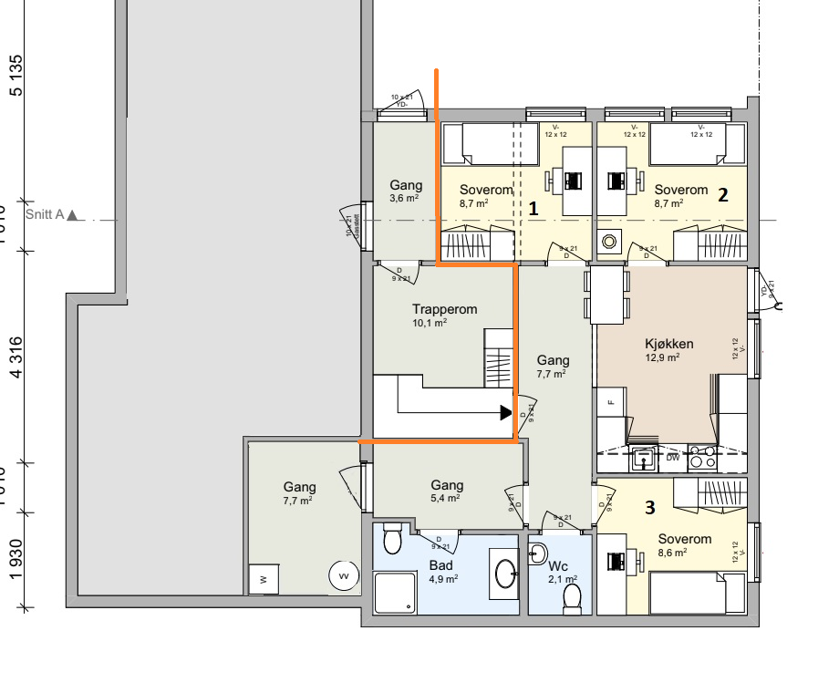 3 soverom, felles kjøkken stue, eget vaskerom (vaskemaskin og tørketrommel) med gode lagringsmuligheter.