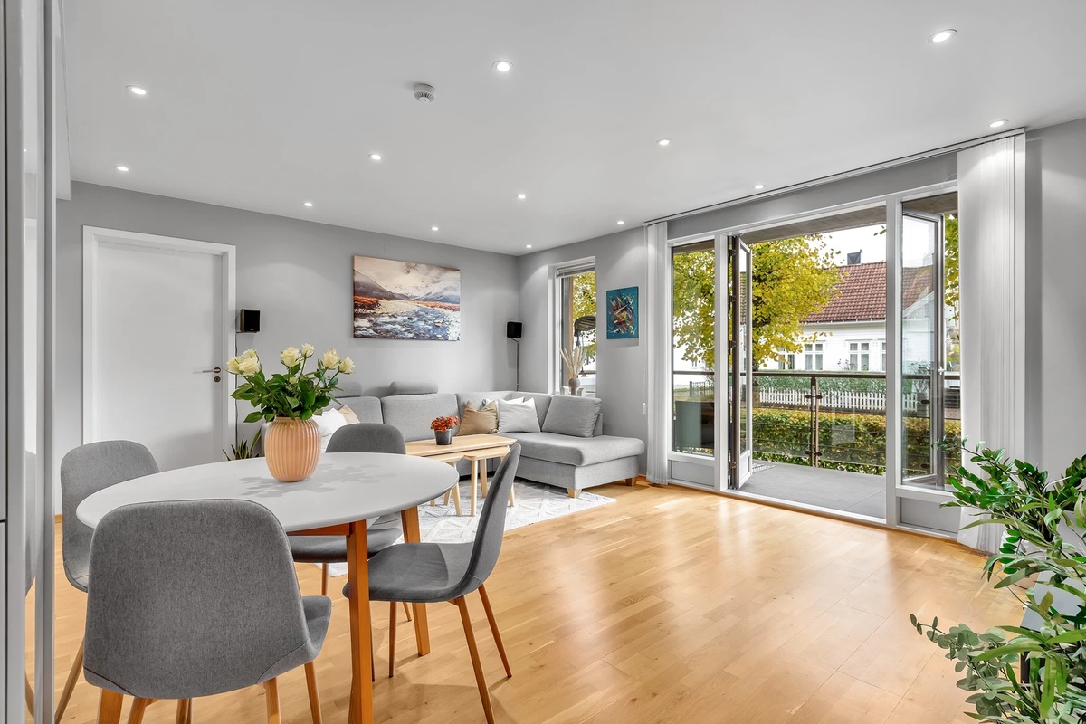 Romslig stue med utgang til balkong med hagemøbler og gassgrill. I stuen er det en stor hjørnesofa, sofabord, spisebord med stoler og stor tv. Spotter i taket.