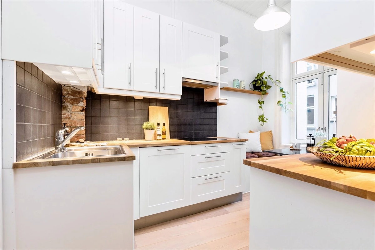 Sofa, Pax Skap, spisebord, stuebord og hvitevarer er inkludert.