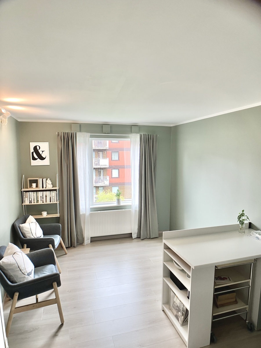 Her bor du for deg selv, i en lys og trivelig leilighet i 3. etg (med heis). Leiligheten er utstyrt med oppheng til ytterklær og skohyller, garderobeskap, godt med oppbevaring på badet, bokhylle og to sett gardiner (lystette og florlette). Kjøkkenkrok med god oppbevaringsplass, kjøleskap med liten fryser, komfyr, servise, glass og bestikk etc.