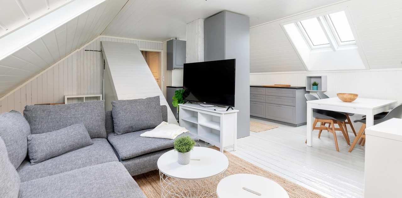 Koselig loftsleilighet. Nyere kjøkken, baderom mm. Del av eldre bygård, midt i sentrum Kristiansand. Butikk like over gata, ellers gåavstand til alle ønskelige kvaliteter.