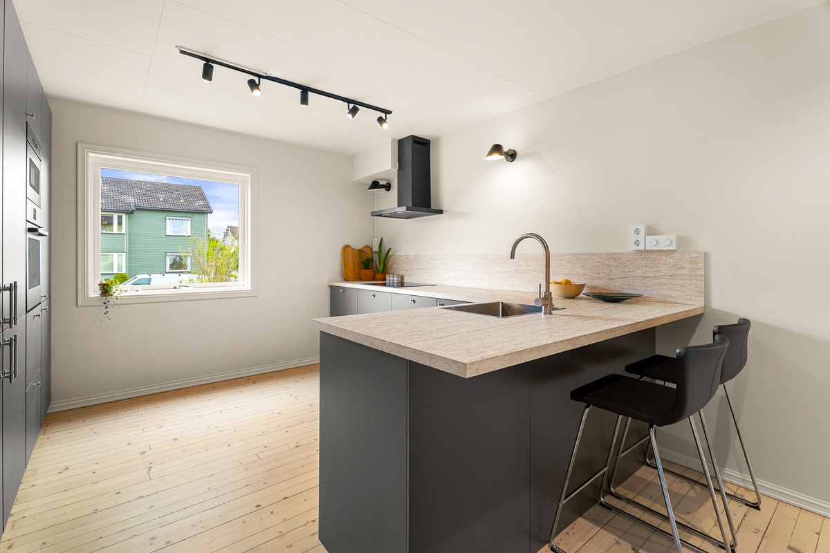 Bildene i annonsen viser tilsvarende rom i boligen. Alle rom har lik stil, fargevalg og møblering, med mindre variasjoner i planløsning.