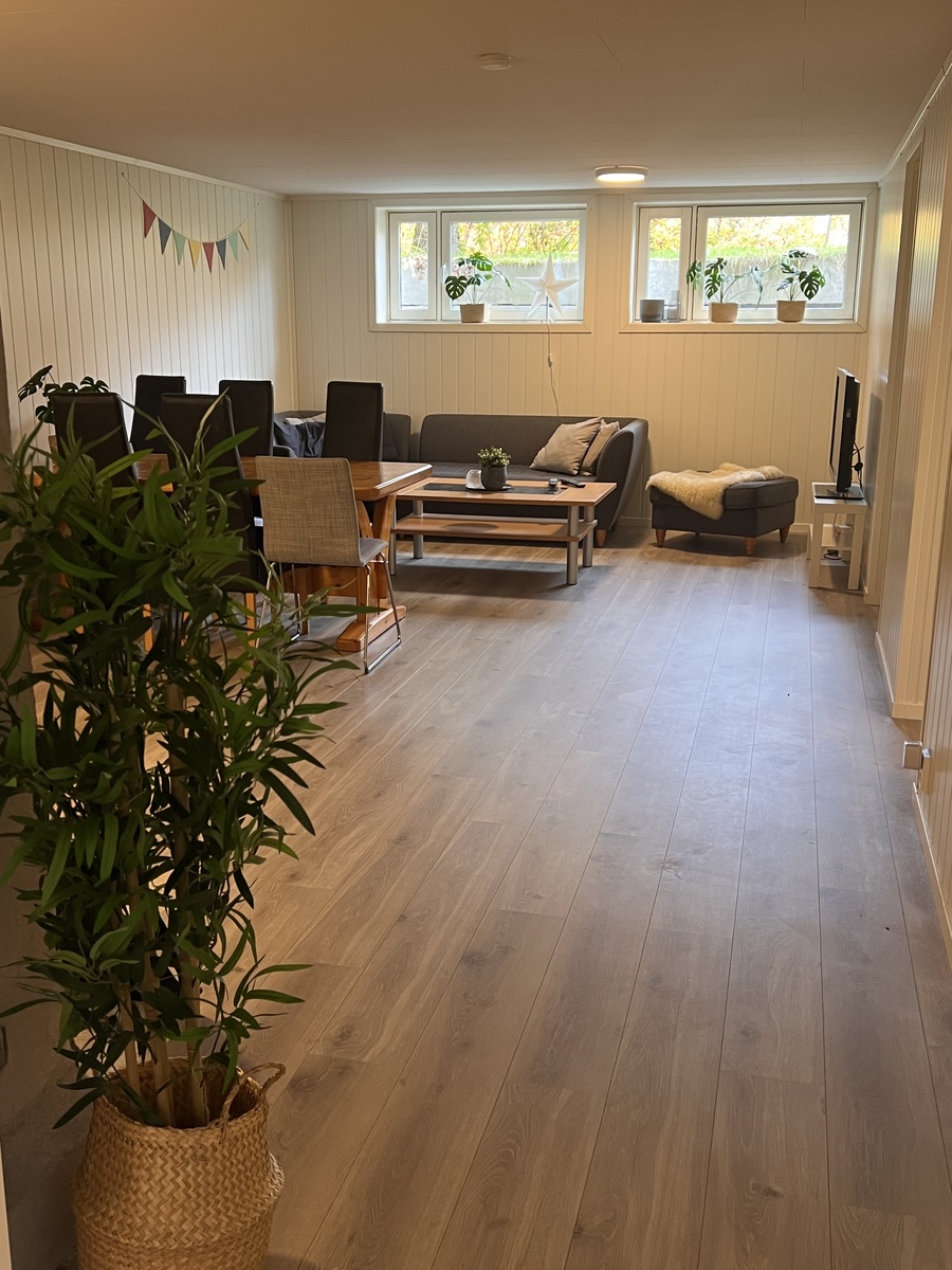Alt av møbler i stue/kjøkken er inkludert i boligen som til et møblert hus. To bad med vaskemaskin. Godt med parkering til biler.