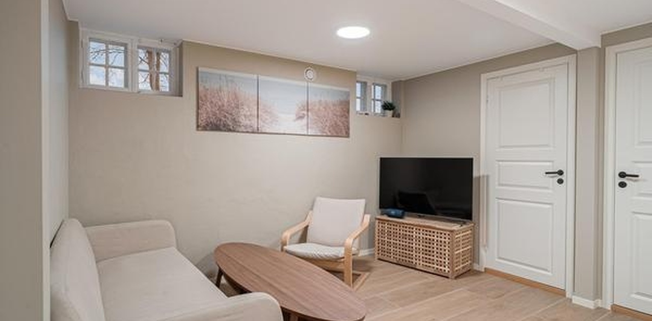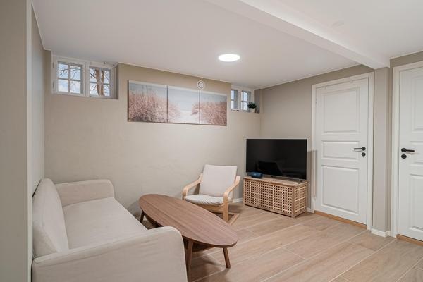 Egen inngang til sokkeletasje. Ferdig møblert med følgende møbler som på bilder: Stue: sofa, bord, stol, tv bord. Gang: garderobeskap 1m. Alle soverom: seng 120 cm, pult og garderobeskap 50-100cm