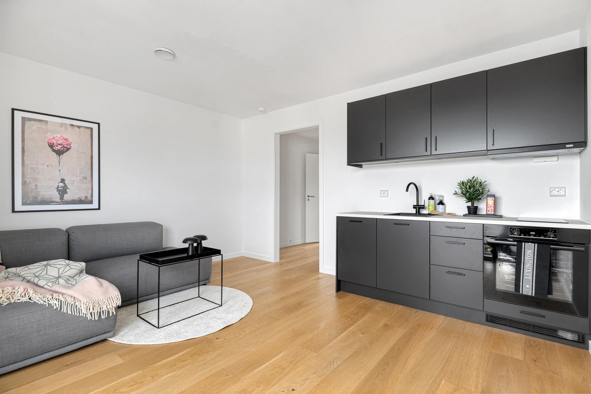 Nytt Epoq kjøkken med integrert stekeovn/induksjonstopp/ventilator/oppvaskmaskin og et frittstående kombiskap.