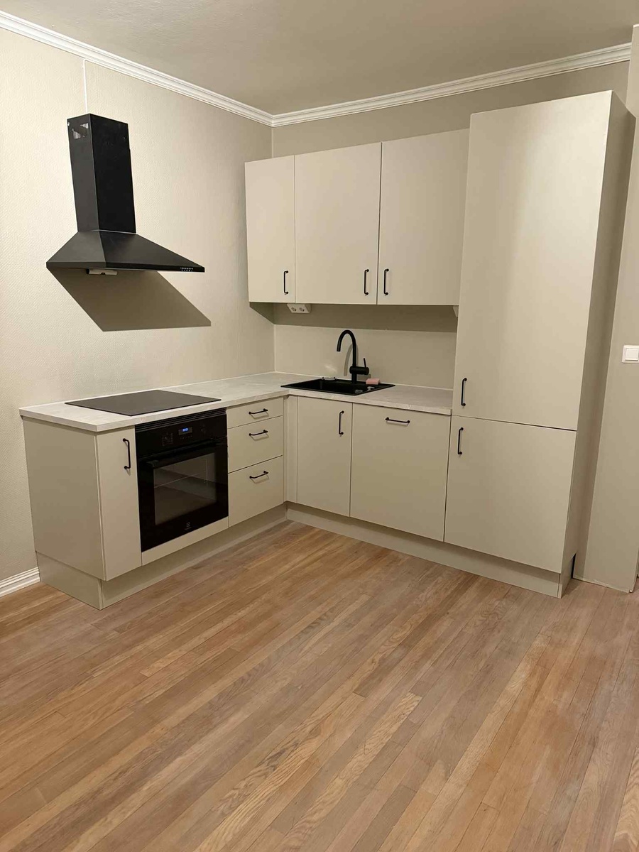Leiligheten er nylig oppgradert og gjort om til en praktisk og moderne 3-roms, med et nytt HTH-kjøkken integrert i stuen og to separate soverom. Perfekt for par, venner som vil bo sammen, eller små familier.
