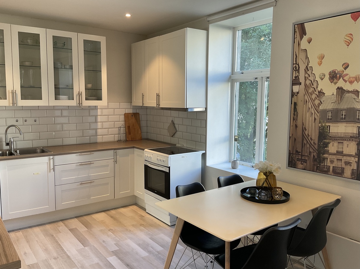 Leiligheten ligger i høy 1. etasje og inneholder et romslig felles kjøkken/allrom med spisebord og en koselig sofakrok. Her er det lagt til rette for å trives! Kjøkkenet er godt utstyrt og har alt av hvitevarer og kjøkkenutstyr: Kjøle/fryseskap, komfyr, microovn, oppvaskmaskin, vaskemaskin og støvsuger.