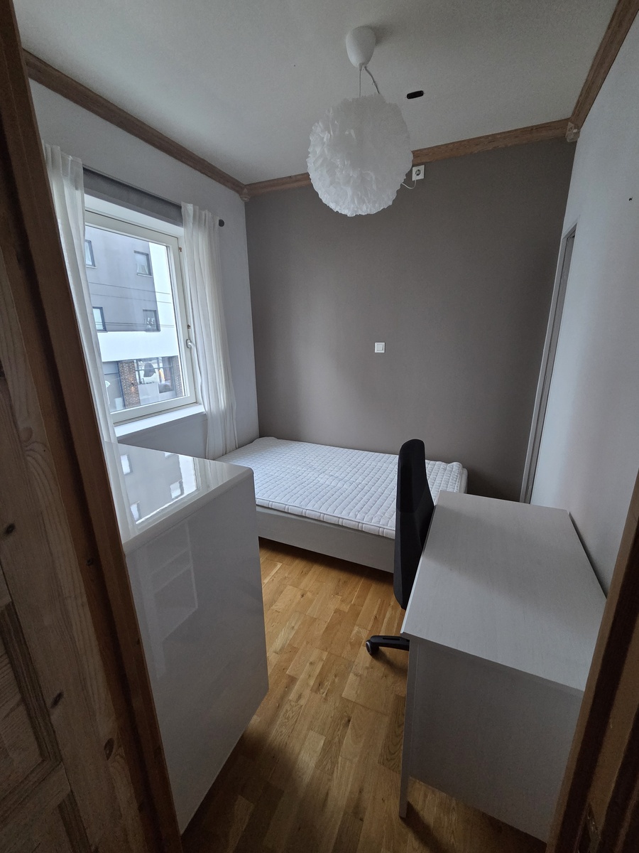 Ledig fra januar til juli, med mulighet for forlengelse. Jeg er en 26 år gammel kvinne som akkurat er ferdig med lærerstudiene. Jeg er generelt sett rolig og ryddig av meg, og liker godt å ha avslappende kvelder hjemme. Ser ideelt sett etter en kvinne rundt samme alder som kan bo i leilighetens andre soverom Rommet leies ut fullt møblert. Strøm, oppvarming og internett er inkludert i leien. Vaskemaskin, tørketrommel og frys finner man nede i kjelleren.