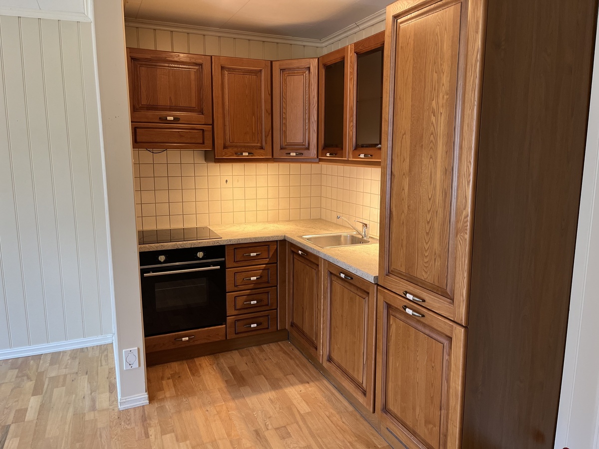 Flislagt bad med varmekabler vaskemaskin og tørketrommel. Kjøkken med oppvaskmaskin,kjøl,frys,steketopp og komfyr.
