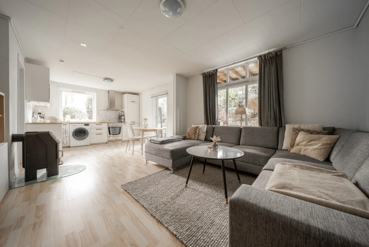 Leiligheten ligger i et rekkehus med flere enheter. Den aktuelle enheten har egen inngang via felles trappehus og disponerer en egen uteplass med gode solforhold – perfekt for å nyte varme dager ute.