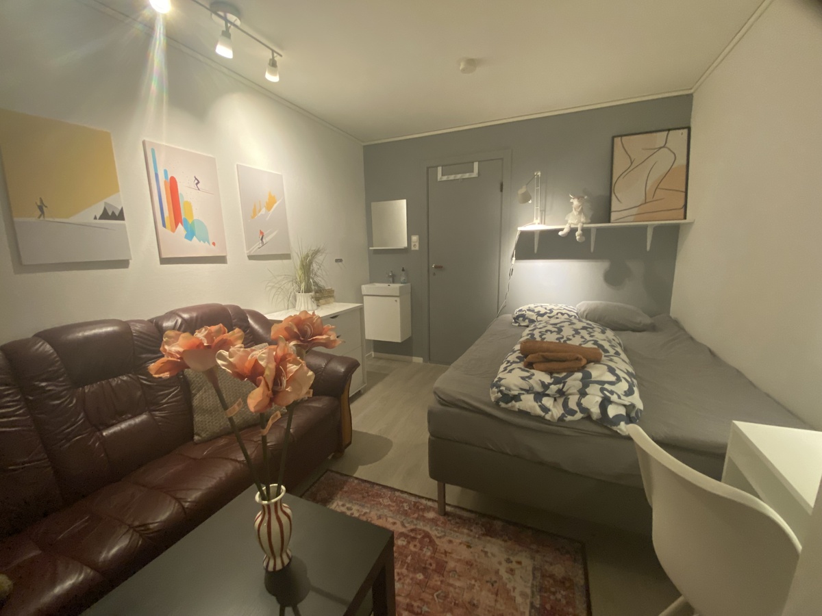 Fullt møblert med 140 cm bred kontinentalsseng og stor skinnsofa., samt en arbeidsplass. Eigen kjøkkensone med eigne kjøkkenskap og eige høgt kombikjøleskap. Fint bad med vaskemaskin. Her deler ein kun men ein snnan bad og kjøkken. Alle kostnad til straum, oppvarming og wifi og eigen parkeringsplass er inkludert i leiga. Bustaden passar for vaksen og roleg person som tek fesren ute på byen:)