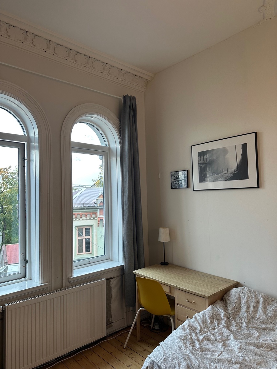 Rom 3: Ledig fra 01.01.26. Ca 10 m2. Veldig god takhøyde med et stort buet vindu med utsikt over Hegdehaugsveien. Rommet leies ut umøblert - men møbler kan kjøpes fra nåværende leietaker om ønskelig. Pris: 8300 + 500 i strøm.