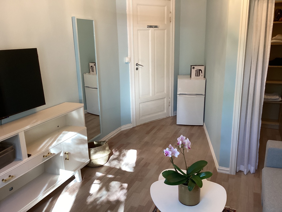Rommet er 15 kvm. inkl. walkincloset. Det inneholder det du ser på bildene(klær/sko er kun for illustrasjon).