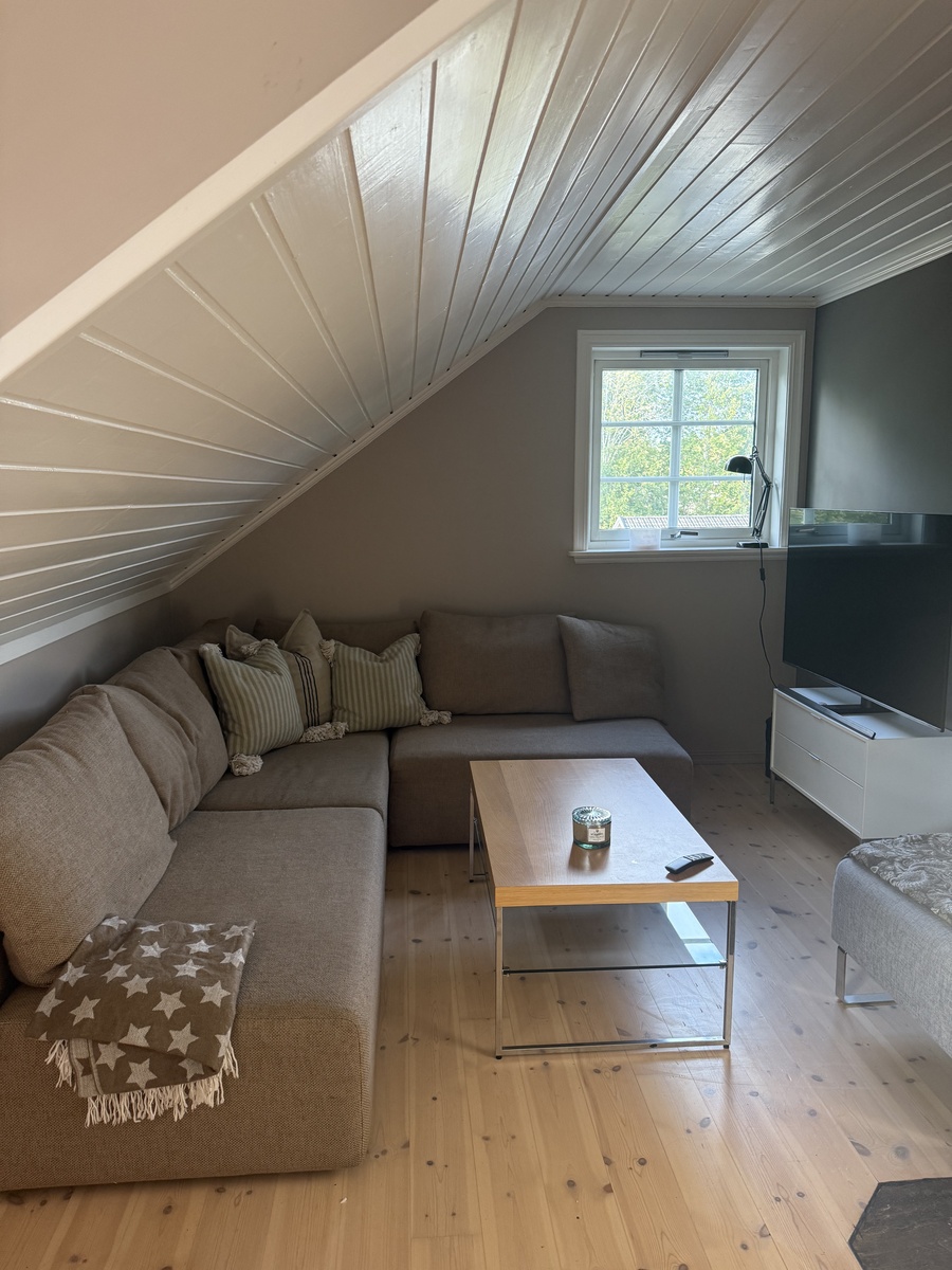Vi leier nå ut en møblert loftsleilighet i en hyggelig tomannsbolig på Nøtterøy. Leiligheten består av egen stue, soverom og bad, mens kjøkkenet deles med oss som bor i huset. Nabolaget er stille og rolig, og tomta går rett ut i på kyststien, og det er gåavstand til sjøen. Det er perfekt for deg som liker tur og natur. Du kan også se sjøen fra balkongen når løvet på trærne forsvinner. Badet er nyoppusset i 2025.