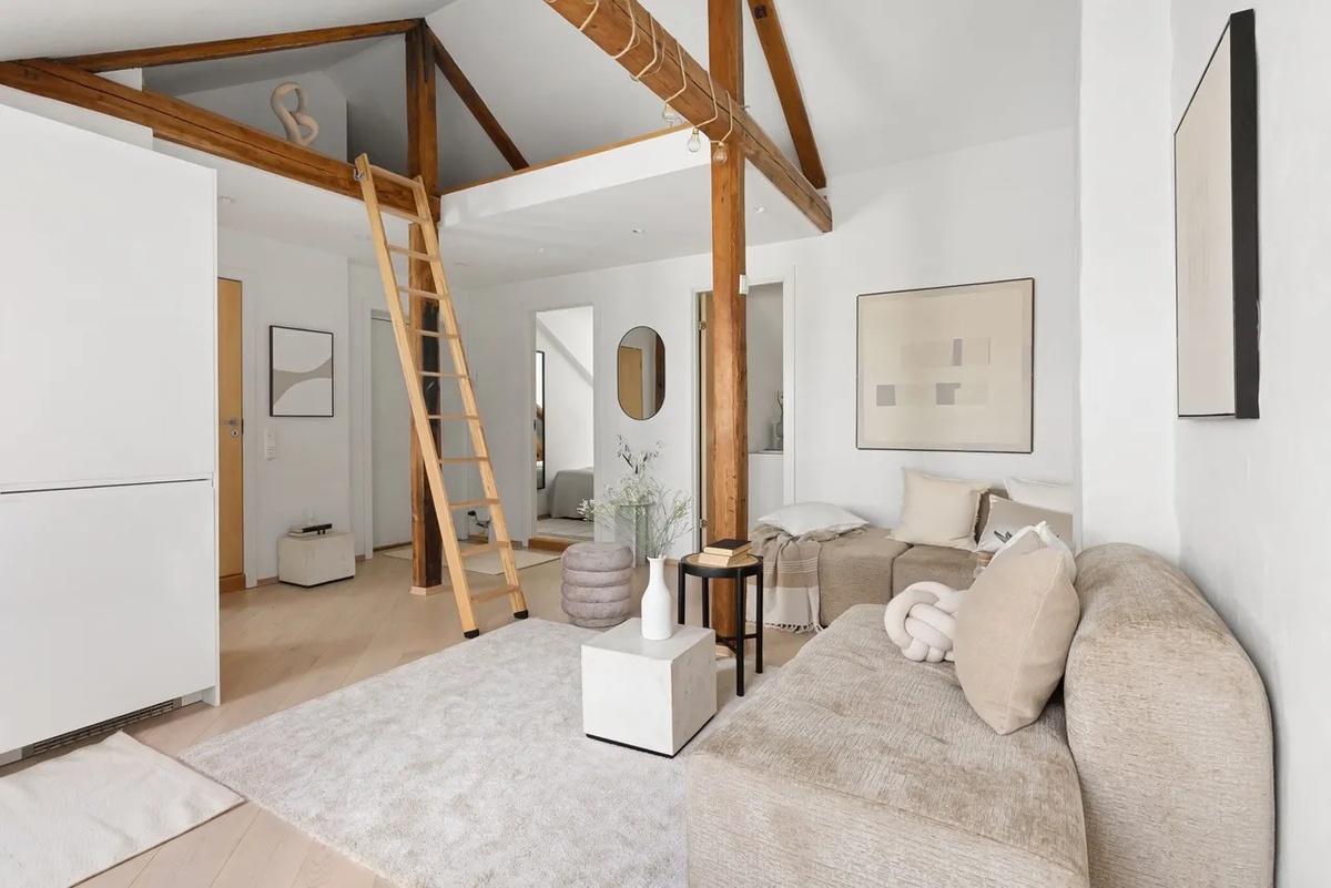 En gjennomgående og sjarmerende loftsleilighet med utsikt mot Barcode, beliggende øverst i en klassisk bygård.