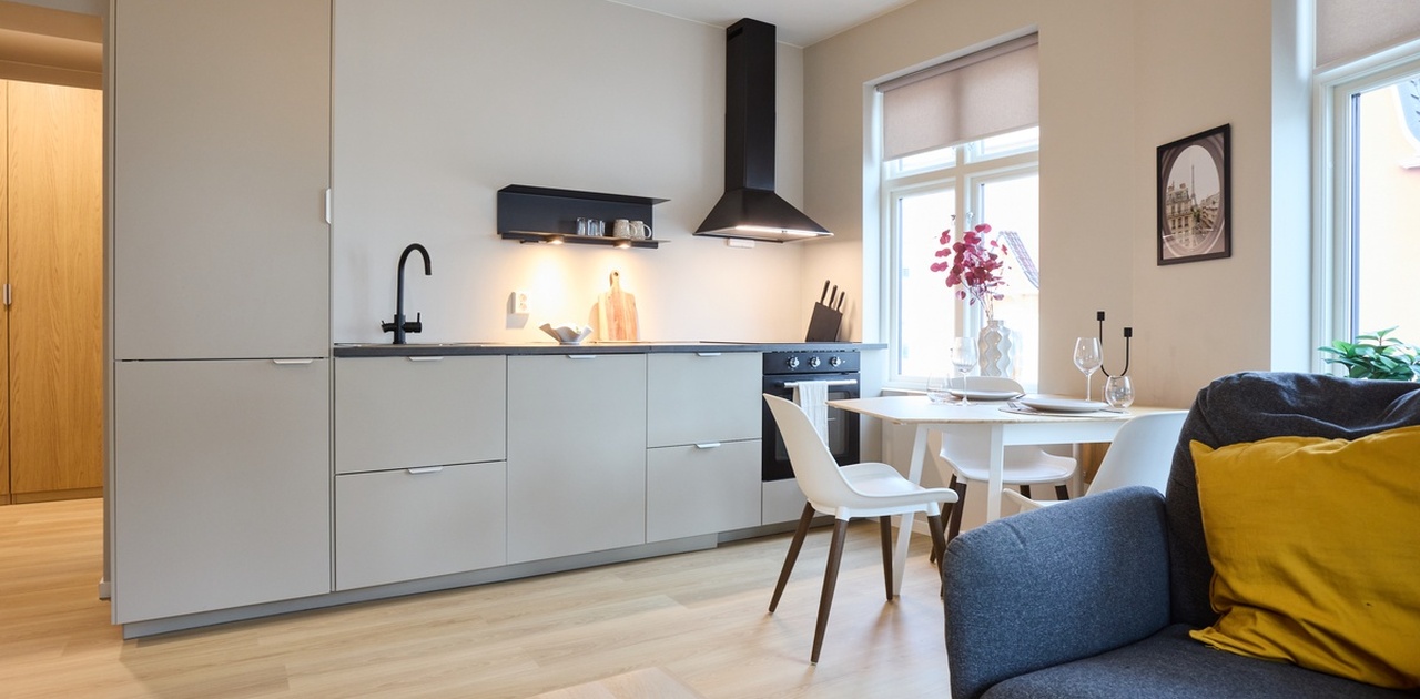 Leiligheten er malt i lyser farger i stue/kjøkken og soverom.
