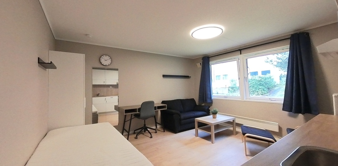 Hybelen er møblert med Sofa, bord, skrivebord, kontorstol, seng og fastmontert garderobeskap.