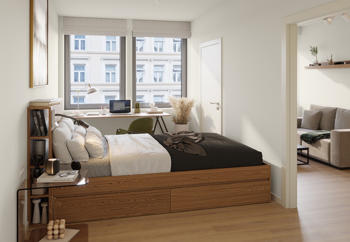 I februar 2026 blir byggetrinn 2 i vårt nyeste prosjekt ferdigstil! Flytt rett inn i vår splitter nye leilighet med eget soverom. Her bor du komfortabelt med god plass, høy standard og moderne preg. Hver enhet er utstyrt med eget soverom (150 seng), eget kjøkken og bad, samt gode oppbevaringsmuligheter med garderobeskap, skuffer under seng og hyller. Leiligheten passer perfekt for par. Boligen er beliggende fra 2 - 5. etasje av eiendommen.