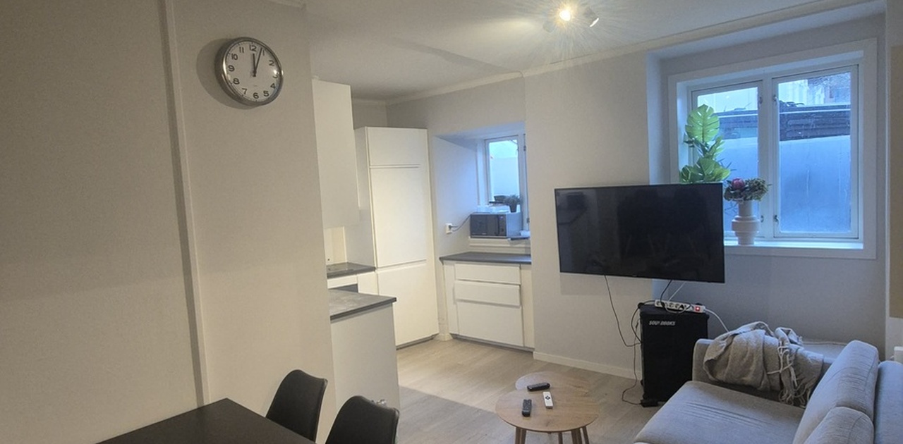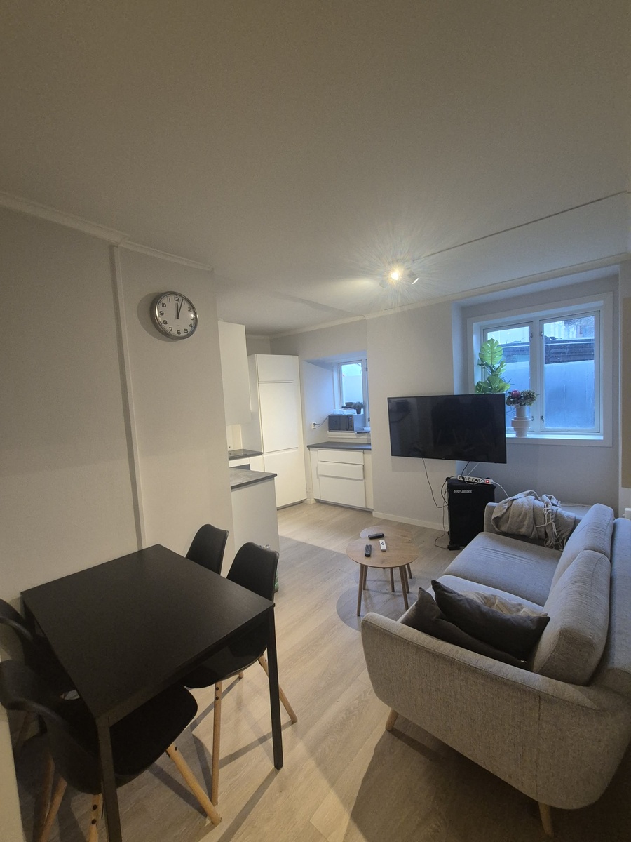 Leiligheten har en koselig stue med sofa, TV og spisebord, i tillegg til et kjøkken som er utstyrt med det man trenger av redskaper. Badet deles mellom beboerne. Det er altså alt på plass for å flytte rett inn, uten å måtte tenke på å skaffe møbler.