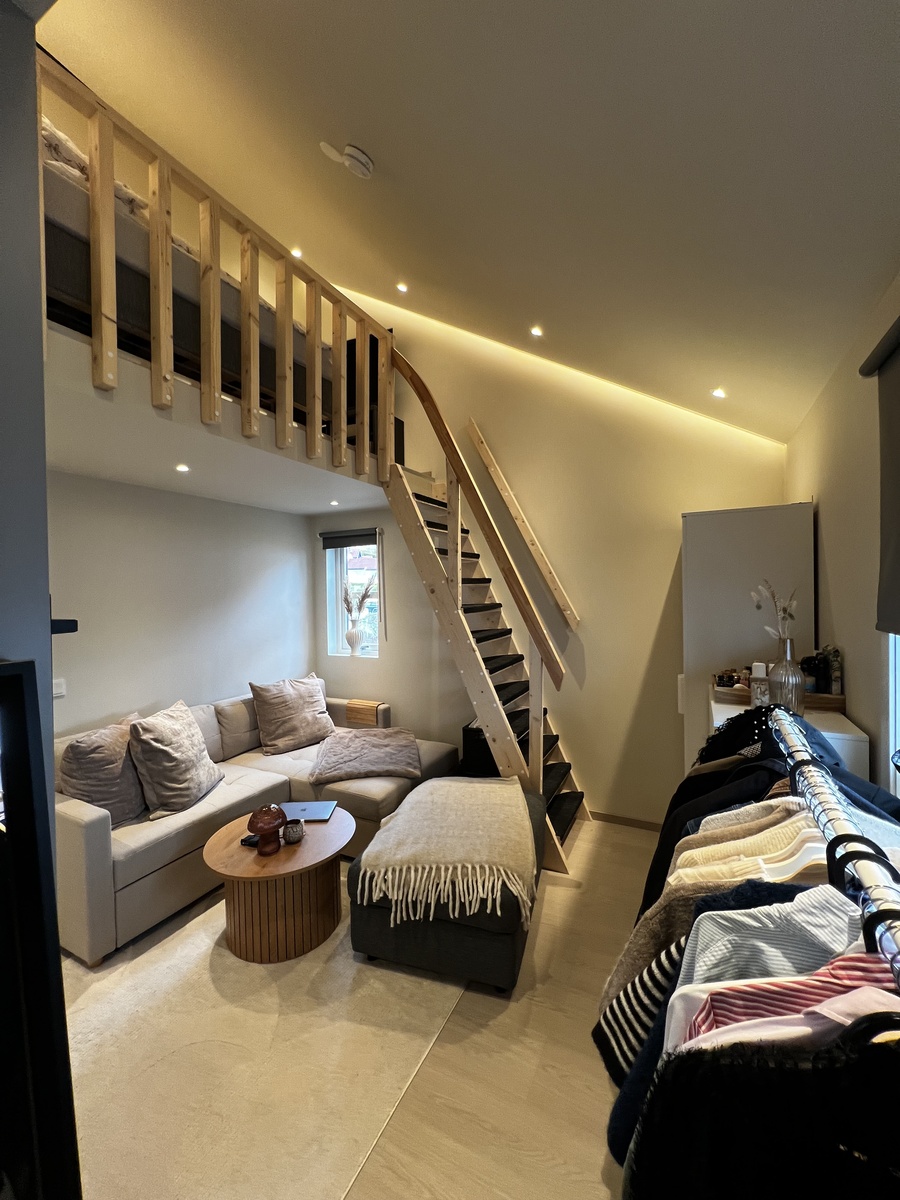 Planløsningen er svært funksjonell med kombinert stue og soverom, hems, åpen kjøkkenløsning og et romslig, delikat bad. Med takhøyde på opptil 5 meter oppleves det som både lyst og luftig.