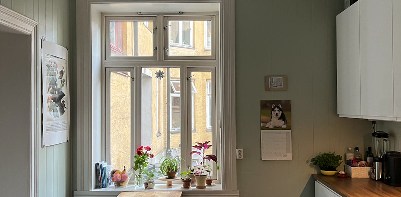 Vi har stor stue og kjøkken med muligheter for å være sosiale sammen, eller med eget besøk. Det er viktig for oss å ha det ryddig med en viss ro i hverdagen. Kjøkkenet er det fellesarealet vi bruker aller mest, og her treffes vi ofte over en kopp te, middag eller et glass vin.