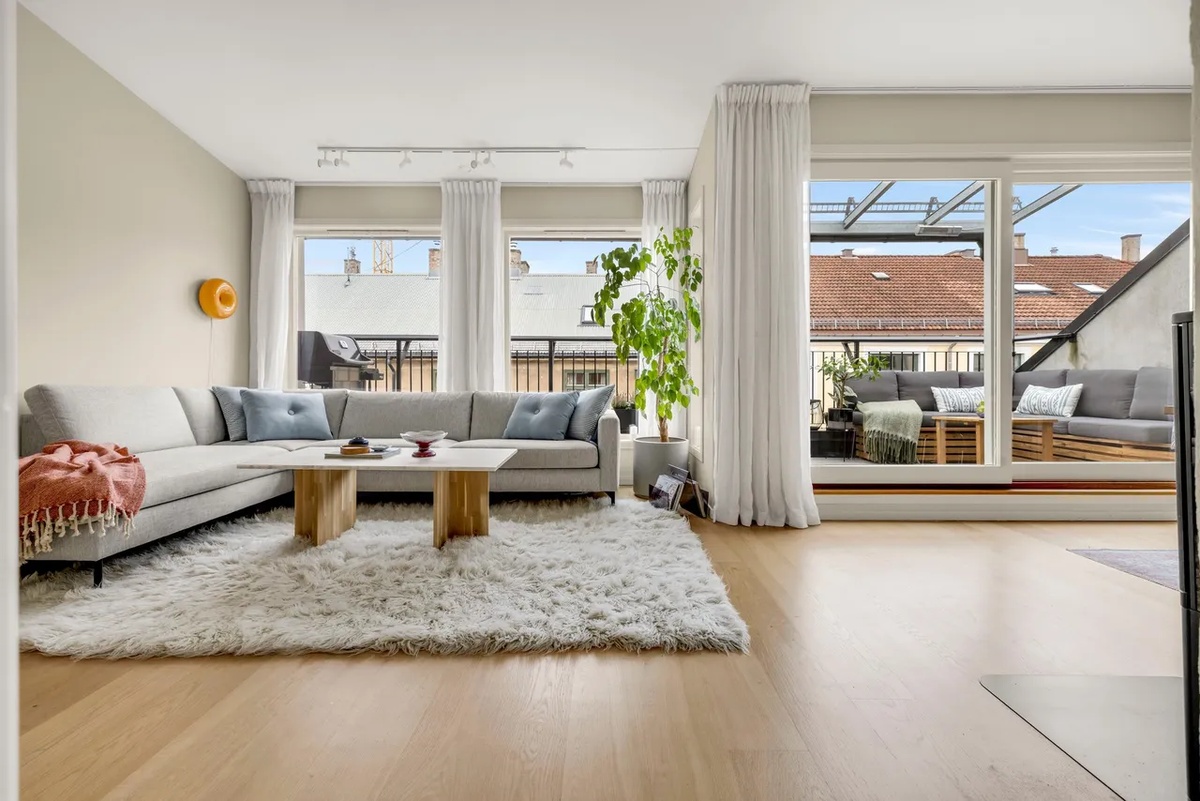 Leiligheten er bygget ny i 2014, så her er det varme i alle gulv, tette vinduer og god standard. Høyt under taket gir god romfølelse.
