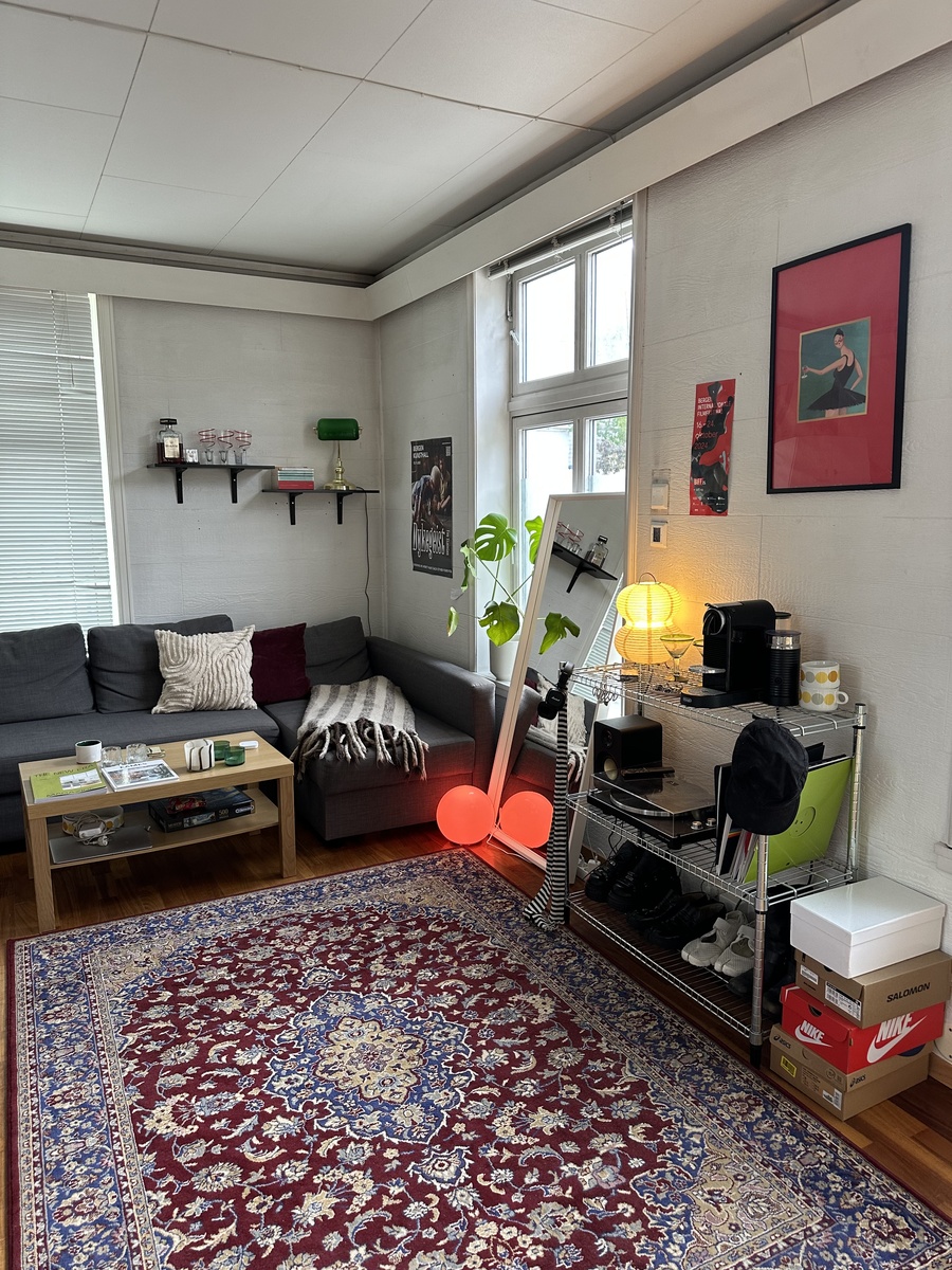 Rommet er veldig stort og føles nesten som en liten leilighet i seg selv 🏡 Med sofaområdet føles det som om du har din egen lille stue i tillegg til soverommet. Rommet leies ut møblert med sofa, sofabord, seng, skap, bokhylle og kommode, og om du ønsker er det også mulig å overta noen av de andre møblene mine. Jeg har trivdes utrolig godt her, og tror virkelig den neste som flytter inn vil få det veldig fint 🌸