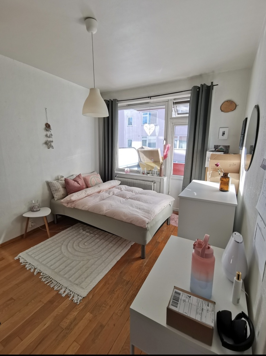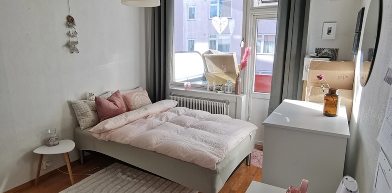 Rommet som leies ut er stort. Det er balkong på rommet og et innebygd skap.
