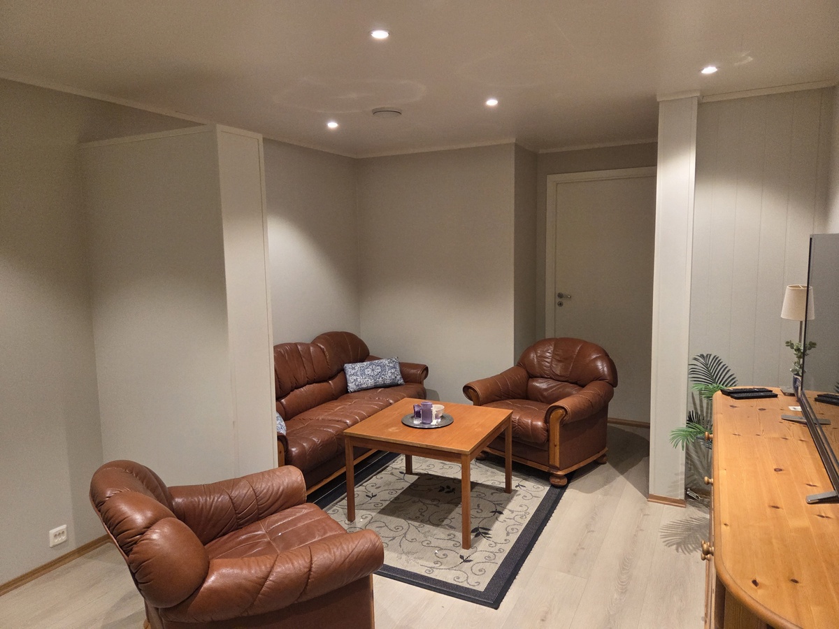 Leiligheten er på ca 110 m2 og har felles oppholdsrom, kjøkken og spiseplass. Godt utstyr med 3 kjøleskap og 2 fryseskap. Oppvaskmaskin og vaskemaskin.