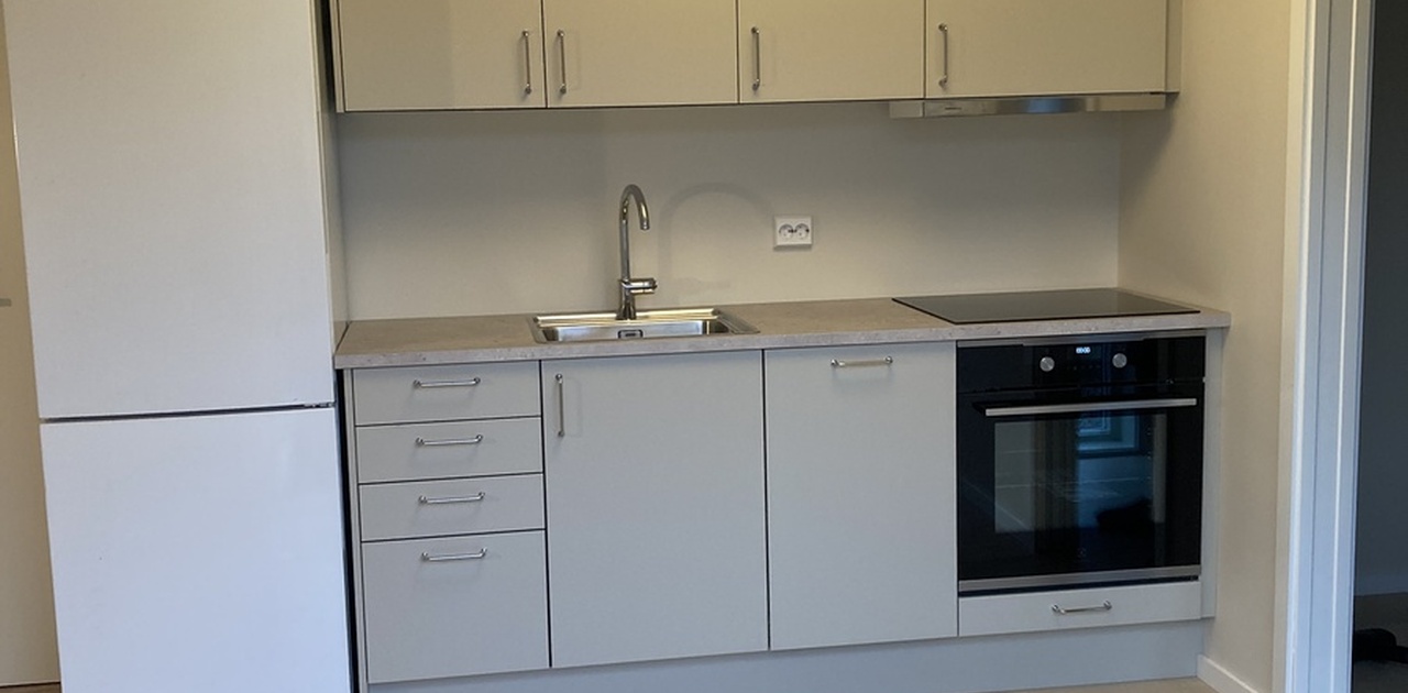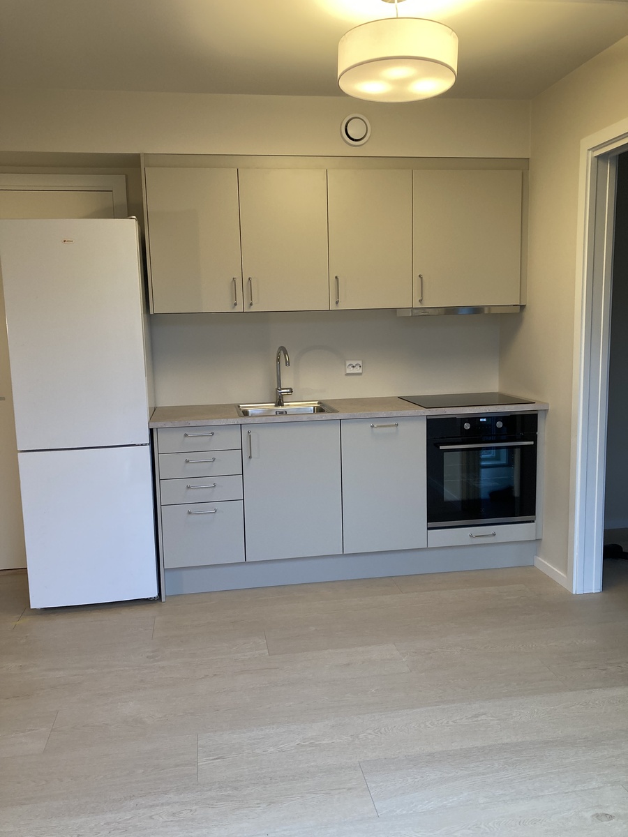 Kjøkkenet er fra Sigdal med integrert ovn og oppvaskmaskin. Det er frittstående kjøleskap med frys også.