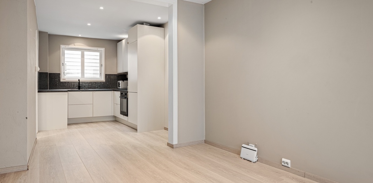 -Gjennomtenkt og praktisk planløsning med åpen stue- og kjøkkenløsning som skaper en luftig og sosial atmosfære.