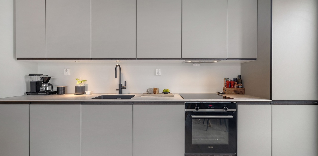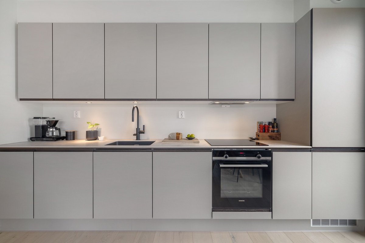 - Lekkert kjøkken med moderne hvitevarer og åpen løsning mot stue.