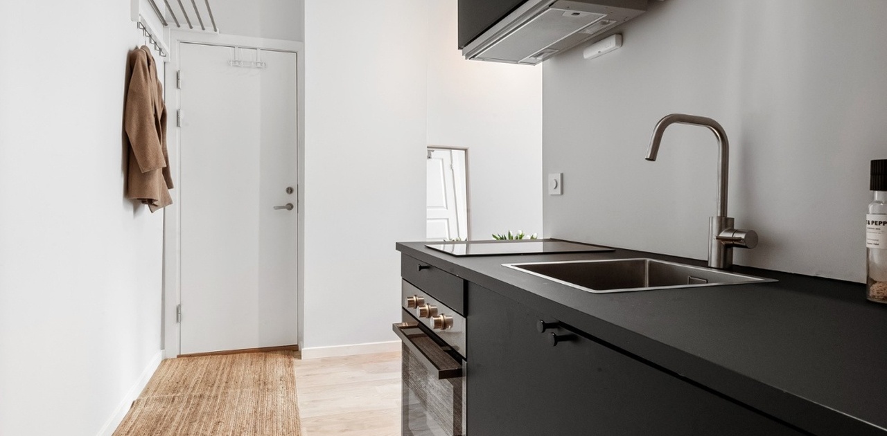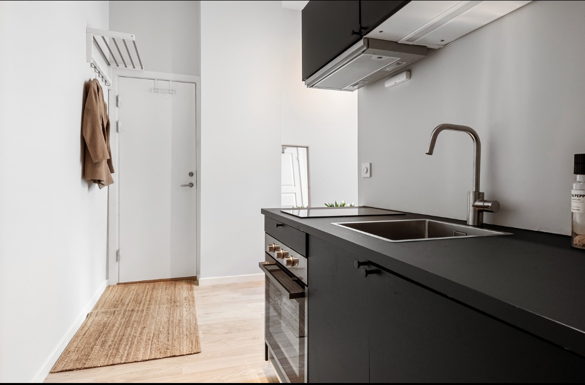 - plasseffektivt kjøkken med stekeovn, platetopp og kjøleskap