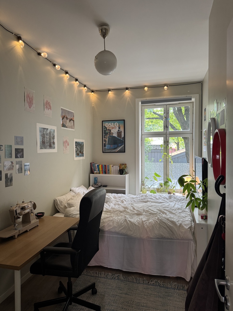 Rommet har et stort vindu med sol hele dagen og utsikt til en fin og rolig bakgård. Rommet leies ut omøblert, garderoben kan bli stående hvis du ønsker det.