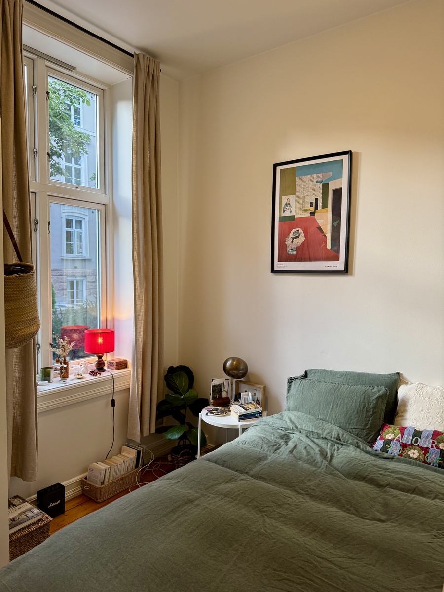 Rommet er ca. 7kvm. Seng og skap følger med! Leiligheten er 65kvm, har tre soverom og to bad. Så du blir kun å dele bad med en annen. Den ligger sentralt ved Pilestredet park. I en rolig gate, og har en stor fin bakgård.