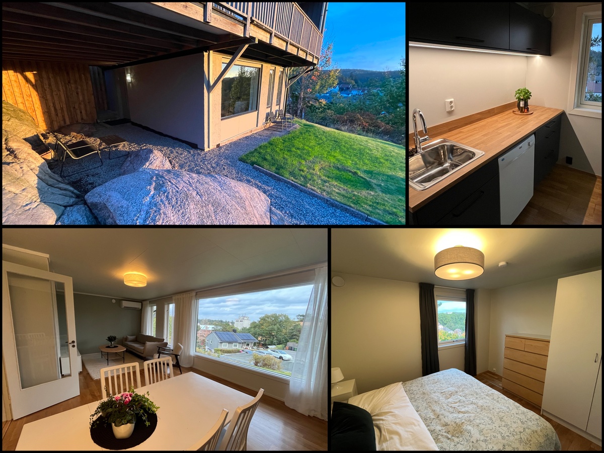 Leiligheten er en sokkelleilighet på 65 kvadrat, med overbygd inngangsparti, som også fungerer som uteplass. Det er egen hage med plen. Leiligheten er nyoppusset, oppleves luftig og har lite innsyn. Utsikt mot byen, morgensol med mange nydelig soloppganger som kan nytes med en kopp kaffi på uteområdet, eller i stua som har store vinduer mot byen.