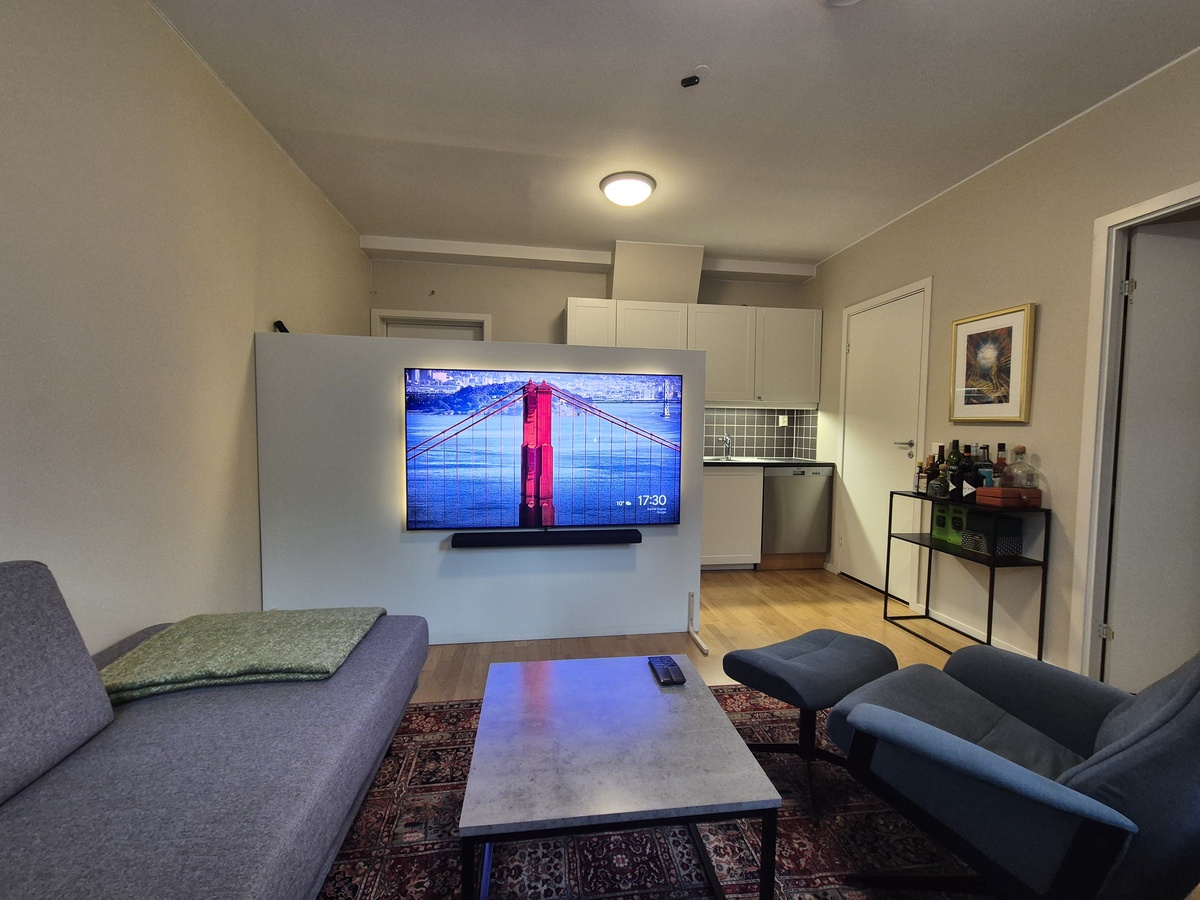 Leiligheten har et romslig bad med dusj og toalett, et eget soverom og en åpen stue og kjøkken løsning. På kjøkkenet har får du alt du trenger av hvitevarer som kombiskap (både kjøl og frys), oppvaskmaskin og komfyr og integrert platetopp.