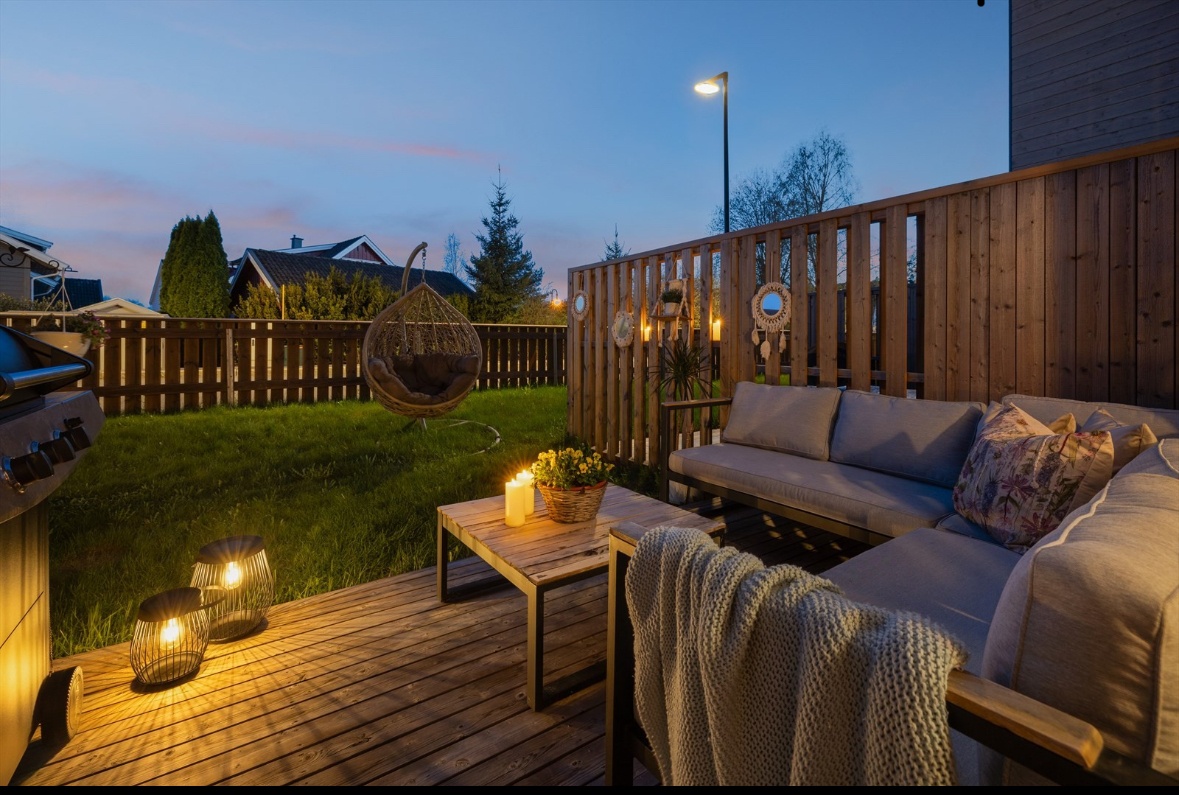 The home is spread over three levels and offers several beautiful patios with very good sun conditions. In addition, you have your own garage space in the communal facilities as well as several practical storage sheds.