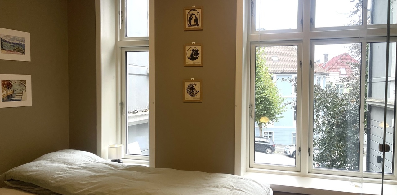 Leiligheten ligger i en koselig gate med lite trafikk. Alle vinduene med unntak av på badet er vendt ut mot gaten, som sammen med god takhøyde, gir en lys og luftig følelse i hele leiligheten. Det er en stor stue med flere sittegrupper, og begge soverommene har god størrelse, slik at du både enkelt kan trekke deg tilbake eller være sosial og ha gjester. Vi er også så heldig å ha en balkong å nyte når bergensværet tillatter det.