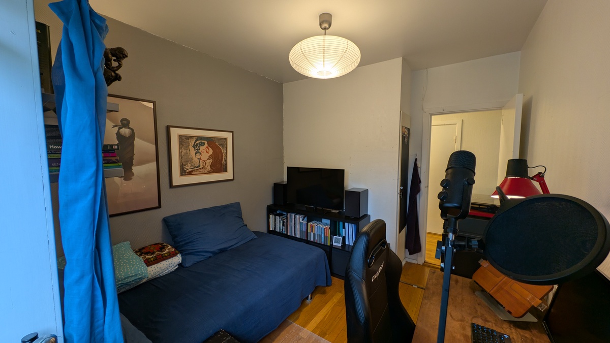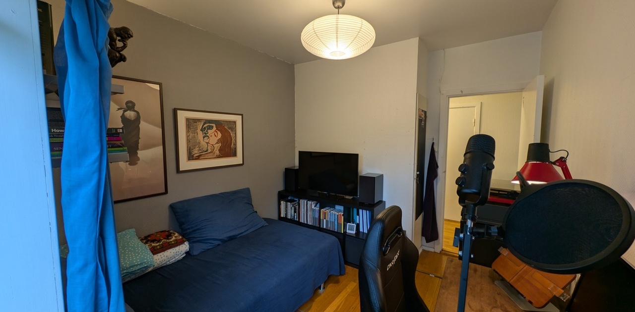 Rommet har ei flatevidde på om lag ni kvadratmeter, en takhøyde på nesten 2,7 meter, og er innretta med innebygd garderobeskap! Du får utsikt over naboens balkong, en fin liten bakgård og Majorstua skole. Om ønskelig kan du overta 120-senga mi, som bildene viser.
