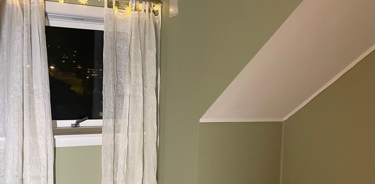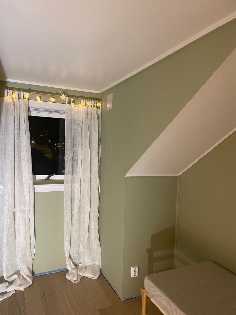 Me leier ut vårt koselige "pikeværelse" på loftet. Rommet ligger i 4.etasje og har flott utsikt sørover. Fra gangen er det inngang til soverommet, toalett og videre til felles vaskerom og tørkeloft. Toalettet deles med naborommet. Det rommet tilhører naboen vår, og her overnatter et familiemedlem to netter i uken.